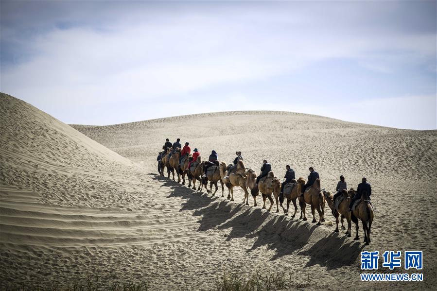 10月16日,游客在羅布人村寨里騎著駱駝游覽。 新華社記者 趙戈 攝