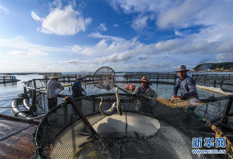 8月18日,南麂島海域內(nèi)的“海上牧場(chǎng)”養(yǎng)殖區(qū)內(nèi),漁民正捕撈大黃魚,處于仿生養(yǎng)殖環(huán)境的大黃魚需要生長(zhǎng)2至3年。進(jìn)入8月,浙江省溫州市平陽(yáng)縣南麂鎮(zhèn)海域上大片的大黃魚、貽貝等特色海產(chǎn)品養(yǎng)殖區(qū)域迎來豐收季節(jié),養(yǎng)殖戶們駕駛漁船在養(yǎng)殖區(qū)海域進(jìn)行打撈收獲,在碧海藍(lán)天下構(gòu)成了一幅“海上牧場(chǎng)”的美麗豐收景象。近年來,南麂鎮(zhèn)政府引導(dǎo)漁民養(yǎng)殖戶充分發(fā)揮“靠海吃?!钡馁Y源優(yōu)勢(shì),大力發(fā)展海洋養(yǎng)殖經(jīng)濟(jì)和海島旅游經(jīng)濟(jì),實(shí)現(xiàn)了南麂由“生態(tài)美”向“產(chǎn)業(yè)美”,“產(chǎn)業(yè)美”向“經(jīng)濟(jì)美”的轉(zhuǎn)變。同時(shí)該鎮(zhèn)堅(jiān)持以大黃魚、貽貝等為特色產(chǎn)業(yè)支撐,精準(zhǔn)發(fā)展高效海洋養(yǎng)殖業(yè),重點(diǎn)培養(yǎng)一批新型職業(yè)漁民,依靠專業(yè)技術(shù)支持,實(shí)現(xiàn)深海仿生養(yǎng)殖,讓好生態(tài)造就好品質(zhì),重點(diǎn)打造南麂養(yǎng)殖品牌,組建營(yíng)銷網(wǎng)絡(luò),拓展特色海產(chǎn)品市場(chǎng)。新華社記者 徐昱攝
