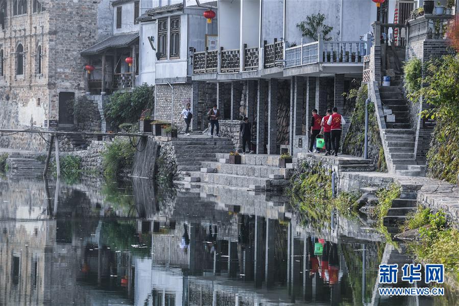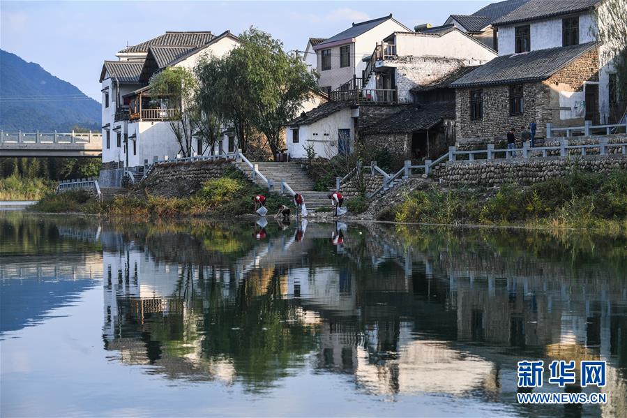 10月17日,河橋鎮(zhèn)的青年黨員們?cè)阪?zhèn)邊的昌南溪投放魚(yú)苗。新華社記者 徐昱 攝