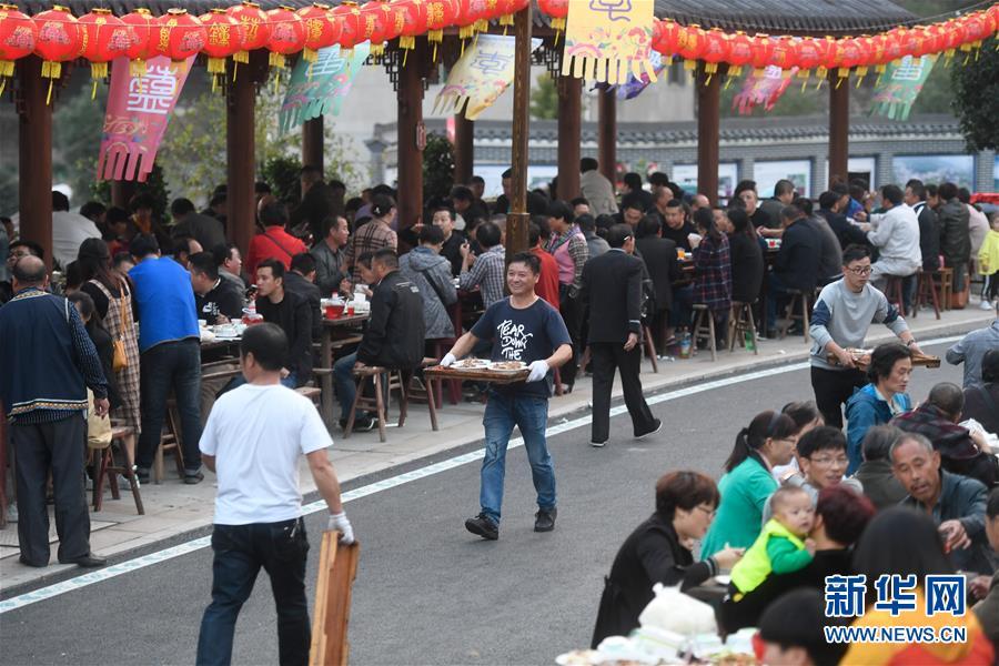 10月17日,村民與賓客在龍峰民族村參加“長桌宴”。 當(dāng)日,在浙江省桐廬縣莪山畬族鄉(xiāng)龍峰民族村,一百桌宴席沿道路擺成一字長蛇陣,四方賓客和當(dāng)?shù)卮迕褚黄鹌穱L著具有畬族特色的菜肴,場面頗為壯觀。 新華社記者 黃宗治 攝