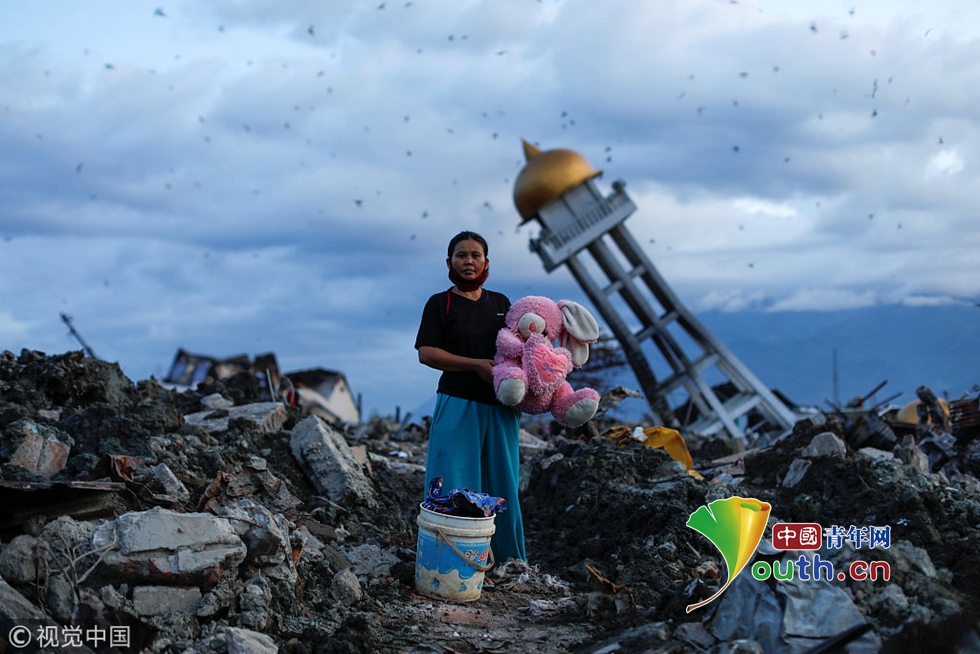 當(dāng)?shù)貢r間2018年10月7日,印尼帕盧,一名婦女在廢墟中找到了一個毛絨兔子玩具,她在地震中失去了三個孩子。圖片作者:JORGE SILVA/視覺中國