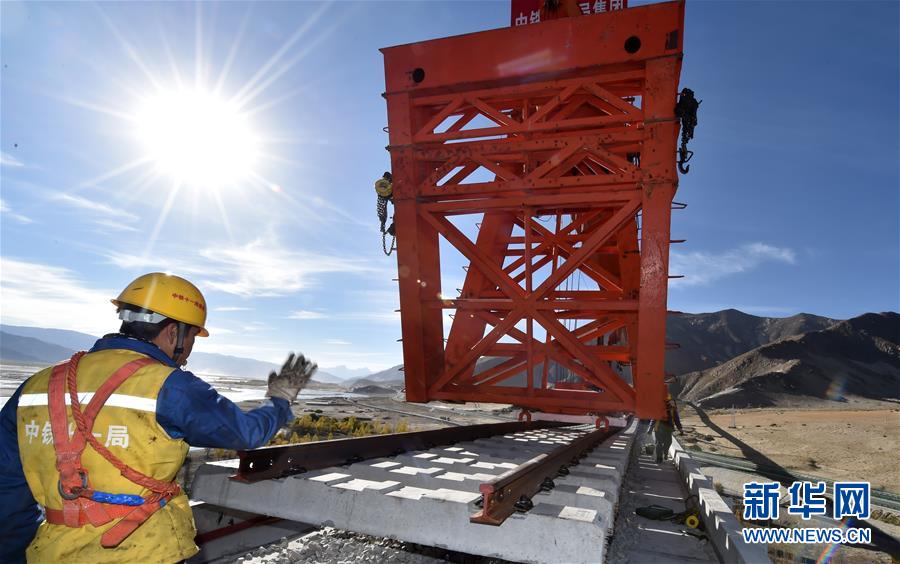 中鐵十一局的工人在川藏鐵路拉林段昌果特大橋進行鋪軌作業(yè)(10月16日攝)。 近日,川藏鐵路拉薩至林芝段昌果特大橋開始鋪設行軌排、架設梁片,標志著川藏鐵路拉林段正式進入鋪軌階段。 新華社記者 覺果 攝