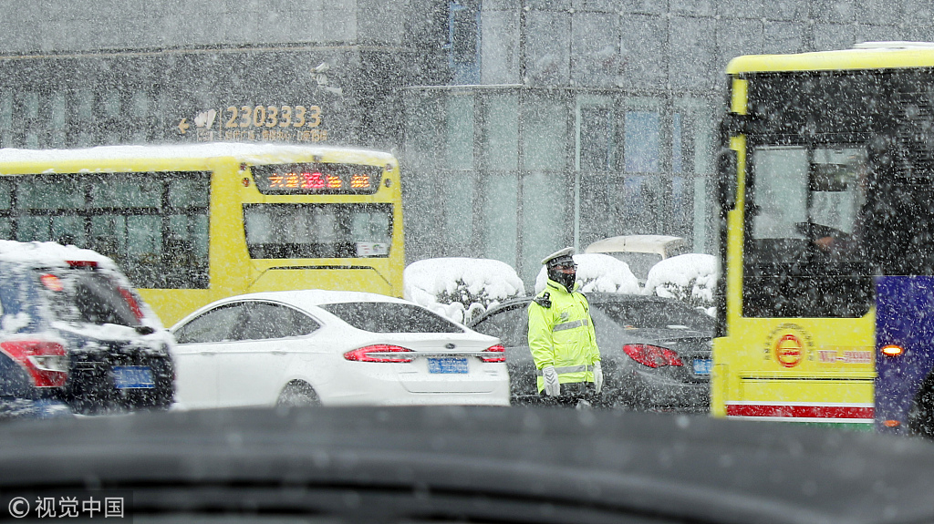 2018年10月18日,在烏魯木齊西大橋,交警冒雪指揮交通。圖片作者:張秀科/視覺中國