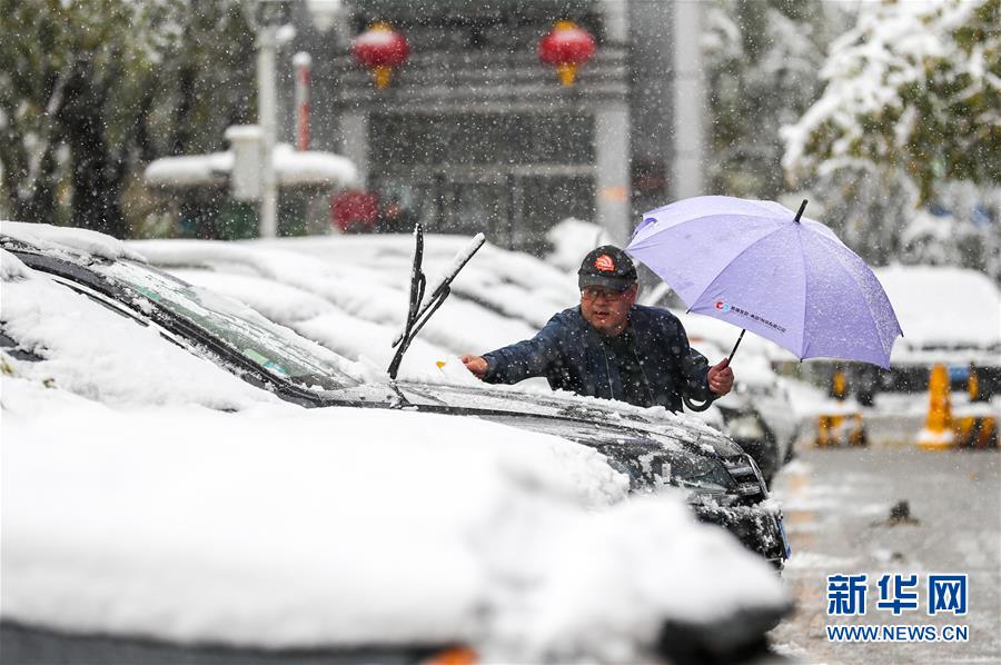 10月18日,烏魯木齊市民在清理車上的積雪。當(dāng)日,新疆烏魯木齊迎來(lái)一場(chǎng)降雪。 新華社記者 江文耀 攝