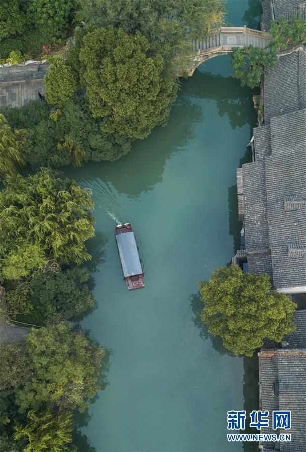 10月18日,游船行駛在烏鎮(zhèn)水道上(無(wú)人機(jī)拍攝)。新華社記者翁忻旸攝