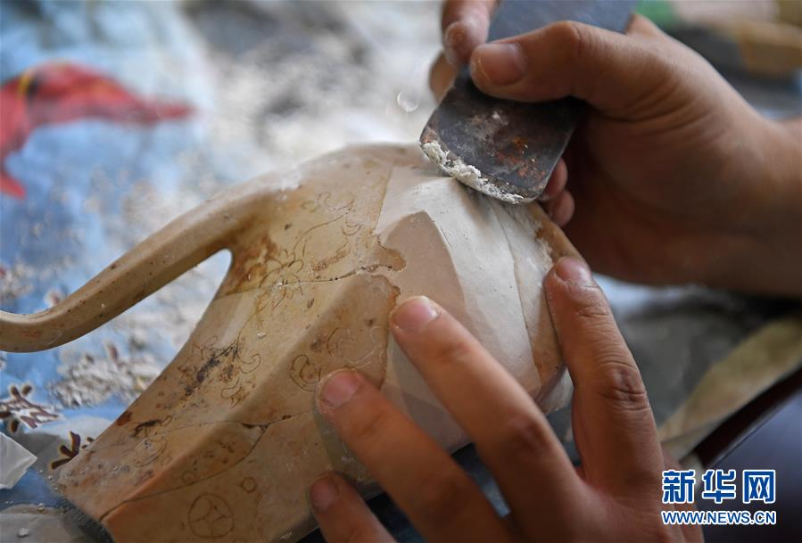 10月18日,在江西景德鎮(zhèn),工作人員修復(fù)一件瓷器。 新華社記者 萬象 攝