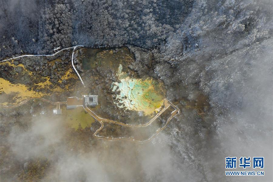 俯瞰黃龍溝五彩池和黃龍寺(10月19日無人機(jī)拍攝)。深秋時(shí)節(jié),在雪山、藍(lán)天、白云和彩林映襯下,黃龍溝中的彩池色彩更加斑斕,目前黃龍景區(qū)進(jìn)入觀賞最佳時(shí)節(jié)。黃龍風(fēng)景名勝區(qū)位于四川省松潘縣境內(nèi),以彩池、灘流、雪山、峽谷、森林等聞名,享有“人間瑤池”“圣地仙境”之美譽(yù)。新華社記者 江宏景攝