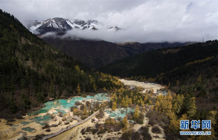 雪山、彩林、彩池構(gòu)成一幅色彩斑斕的畫卷(10月19日無人機(jī)拍攝)。深秋時(shí)節(jié),在雪山、藍(lán)天、白云和彩林映襯下,黃龍溝中的彩池色彩更加斑斕,目前黃龍景區(qū)進(jìn)入觀賞最佳時(shí)節(jié)。黃龍風(fēng)景名勝區(qū)位于四川省松潘縣境內(nèi),以彩池、灘流、雪山、峽谷、森林等聞名,享有“人間瑤池”“圣地仙境”之美譽(yù)。新華社記者 江宏景攝