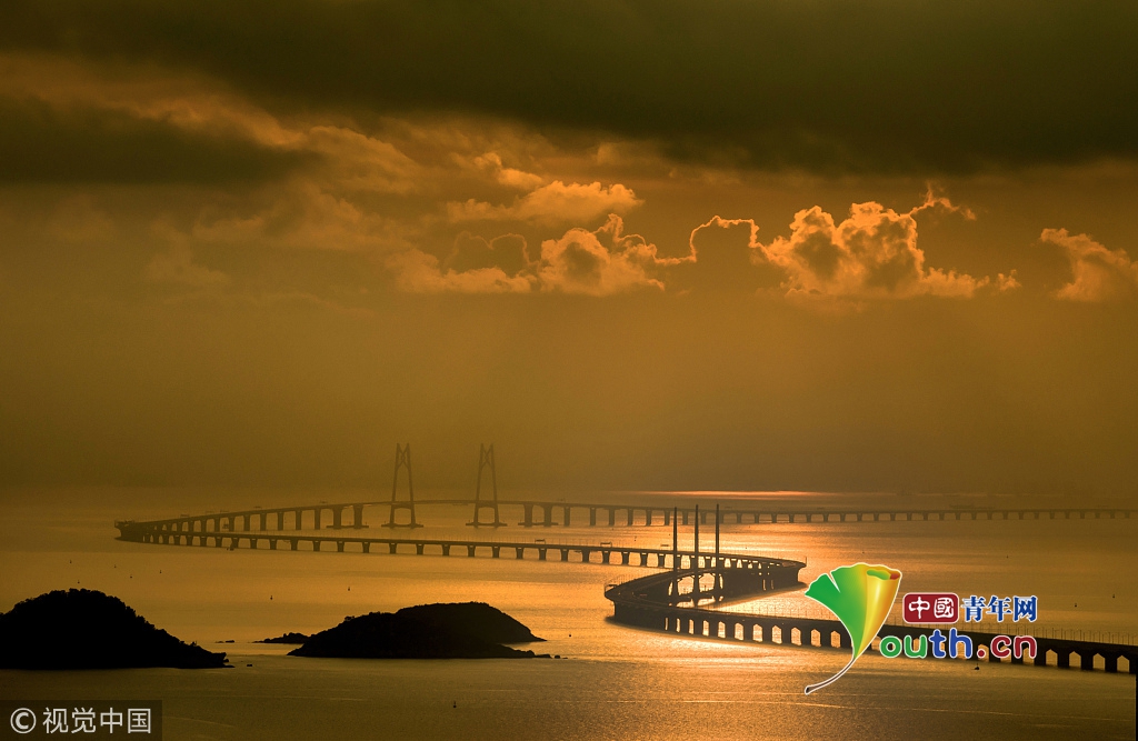 2018年5月21日,廣東珠海,太陽(yáng)從香港大嶼山慢慢升起,港珠澳大橋猶如一條巨龍蜿蜒盤(pán)繞在海面上。