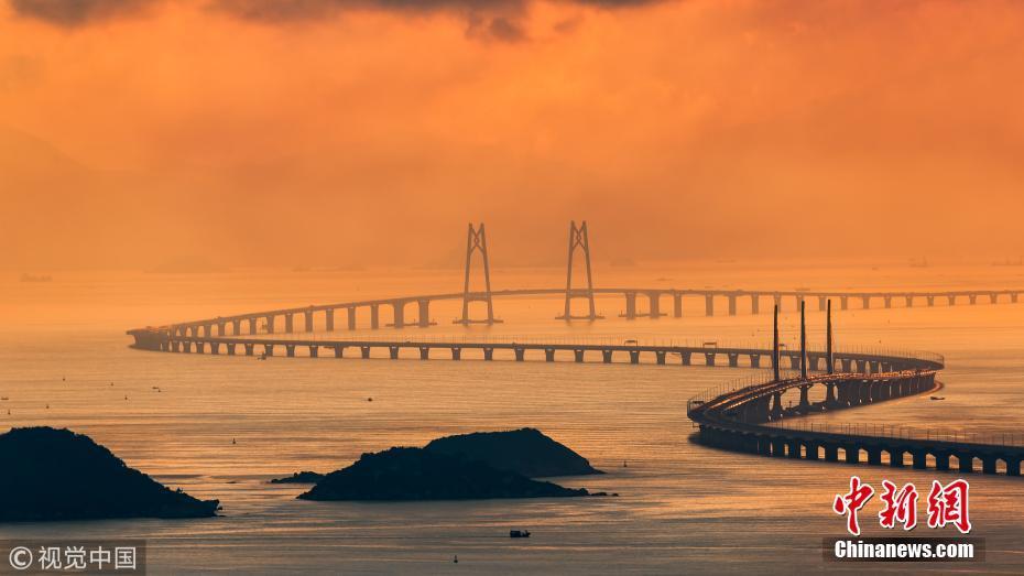 2018年7月18日,珠海,滿(mǎn)天紅霞,亮燈后的港珠澳大橋跨立在伶仃洋上,進(jìn)入通車(chē)前的最后準(zhǔn)備。張由瓊 攝 圖片來(lái)源:視覺(jué)中國(guó)