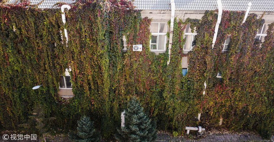 2017年10月21日,沈陽,懷遠(yuǎn)樓北側(cè)的墻面也是被爬墻虎所覆蓋,由于陽光很少能照射到植被,所以爬墻虎大都還是綠色。
