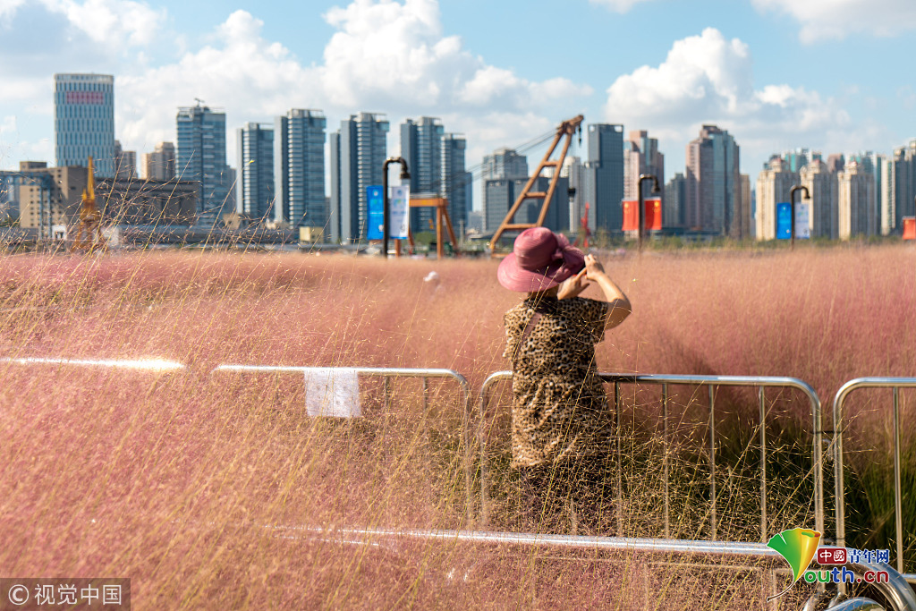 2018年9月28日,上海,東外灘楊浦濱江的粉黛亂子草目前已進(jìn)入盛花期,當(dāng)日早間,不少市民來(lái)到濱江拍照賞景,成片的紫色花海在藍(lán)天白云映襯下美不勝收。圖片作者:王岡/視覺(jué)中國(guó)