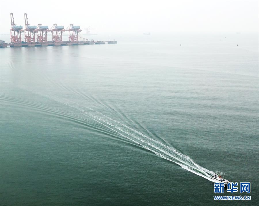 10月24日,一艘運輸貨物的快艇行駛在廣西防城港碼頭海域(無人機(jī)拍攝)。 新華社記者 魏海 攝