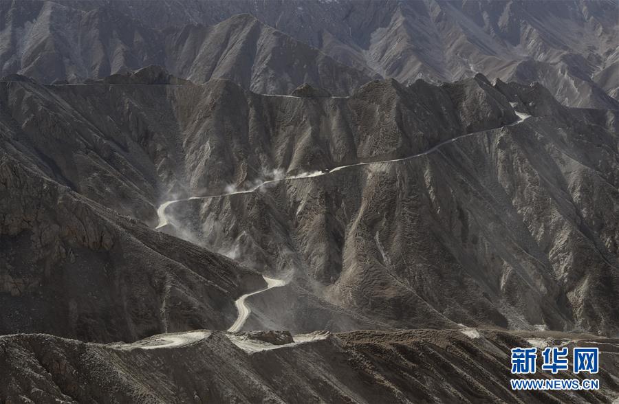 在距離且末縣縣城160多公里的昆侖山上的興發(fā)達(dá)玉礦,可見對(duì)面山上運(yùn)載銅鋅礦礦石的卡車行駛在簡易礦山公路上(10月23日攝)。 新華社記者武巍攝
