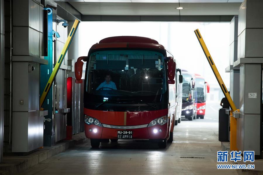 10月24日,跨境巴士在澳門口岸離境車道上通關(guān)。當(dāng)日9時,港珠澳大橋正式通車。 新華社記者張金加攝