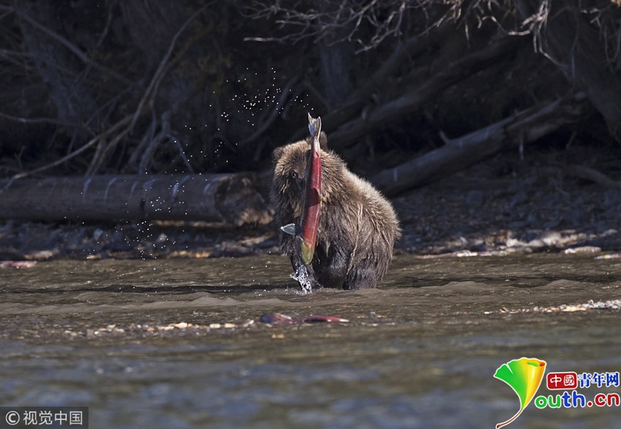 2018年10月29日訊(具體拍攝時(shí)間不詳),加拿大英屬哥倫比亞,一只15個(gè)月大的棕熊幼崽在Chilko Lake湖畔成功捉到一只4公斤重的紅色鮭魚(yú)。