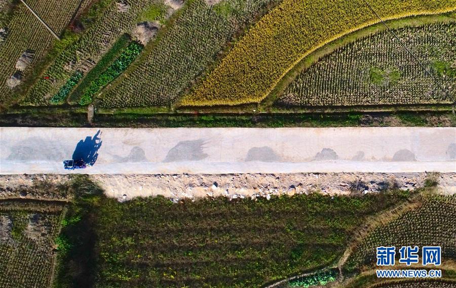 10月30日,曾紀(jì)連載著電影放映設(shè)備穿過稻田,準(zhǔn)備為村民們放映電影(無人機拍攝)。新華社記者 胡晨歡攝