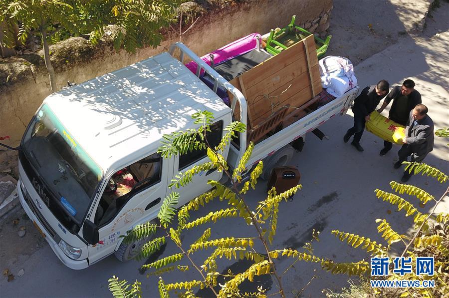 在隴南市武都區(qū)“新坪埡”,村民將山上搬下來(lái)的物品搬進(jìn)新房(10月31日攝)。新華社記者 范培珅攝