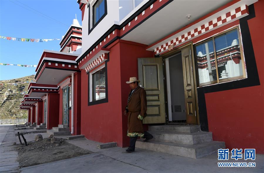 在隴南市武都區(qū)“新坪埡”,一名已搬遷入住的村民走出自家房屋(10月31日攝)。新華社記者 范培珅攝