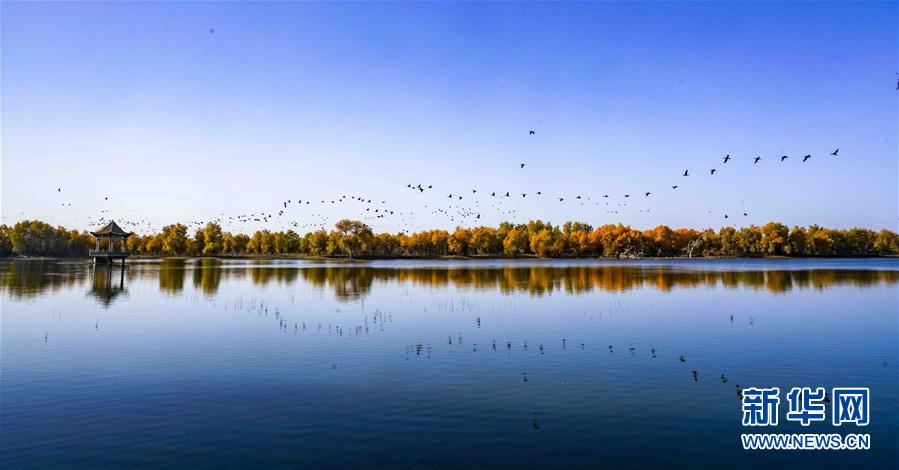 在位于新疆巴音郭楞蒙古自治州輪臺縣的一處胡楊林里,一群鳥從水面上飛過(10月25日攝)。 新華社記者 趙戈 攝