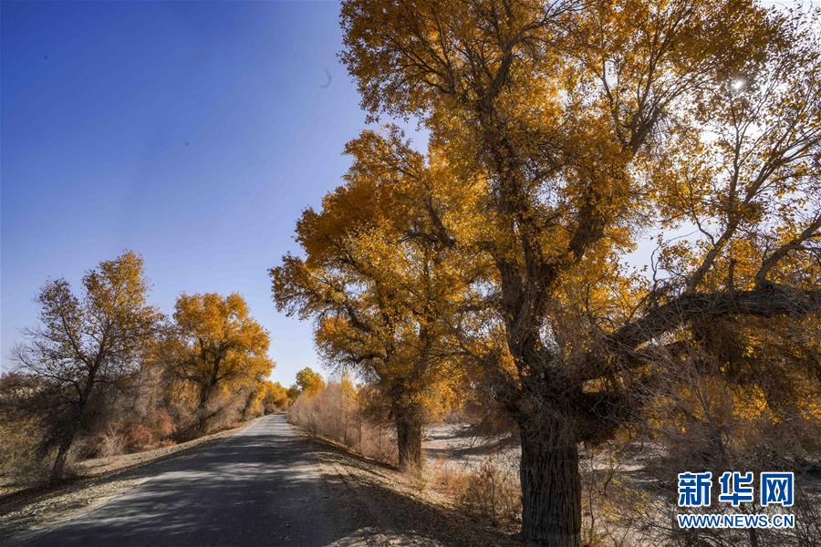 新疆輪臺縣胡楊林深處的一條小路(10月25日攝)。 10月中下旬,靜靜的塔里木河中下游一片金黃。胡楊深處,條條小路蜿蜒綿長通向遠(yuǎn)方,引人入勝。 塔里木河是中國最長的內(nèi)陸河,這一區(qū)域原始胡楊林分布較為集中。隨著塔里木河連續(xù)19次向下游生態(tài)輸水,為胡楊林“解渴”,塔河兩岸生態(tài)得到明顯改善,沙地面積逐年減少。 新華社記者趙戈攝