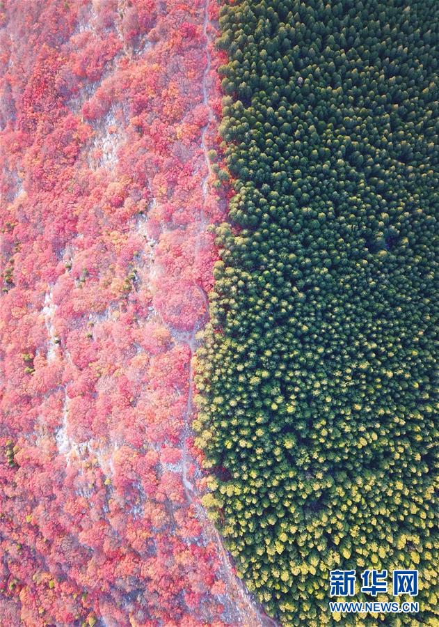 深秋時節(jié),山東濟(jì)南楔子山山脊兩邊種植的植被形成“一山雙色”景觀,令人稱奇。