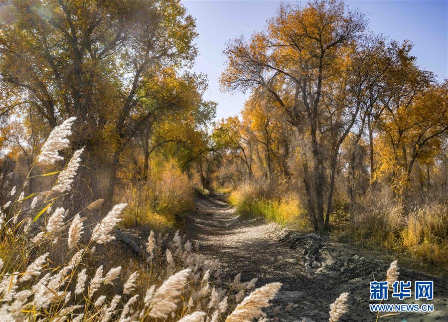 新疆輪臺縣胡楊林深處的一條小路(10月25日攝)。 10月中下旬,靜靜的塔里木河中下游一片金黃。胡楊深處,條條小路蜿蜒綿長通向遠方,引人入勝。 塔里木河是中國最長的內(nèi)陸河,這一區(qū)域原始胡楊林分布較為集中。隨著塔里木河連續(xù)19次向下游生態(tài)輸水,為胡楊林“解渴”,塔河兩岸生態(tài)得到明顯改善,沙地面積逐年減少。 新華社記者趙戈攝