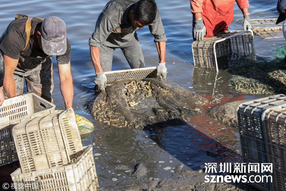 深圳新聞網(wǎng)訊 2018年9月8日,遼寧丹東,早上5點(diǎn),挖蟶人紛紛下到各個(gè)池子,要在海水海泥里艱辛勞作10小時(shí),直至下午3點(diǎn)集體上岸,等待買(mǎi)家的運(yùn)輸車(chē)隊(duì)運(yùn)走他們的勞動(dòng)成果。9月初,遼寧沿海養(yǎng)殖區(qū)進(jìn)入養(yǎng)殖海鮮的收獲季。在東港,常常出現(xiàn)數(shù)百人乃至上千人集結(jié)在池子里挖蟶子(這里特指縊蟶,即東港當(dāng)?shù)厝怂f(shuō)的小人仙。下同)的壯觀景象。在養(yǎng)殖海鮮的收獲季,成群的海鷗趁機(jī)“助陣“,人與大自然和諧共處的畫(huà)面令人嘆為觀止。