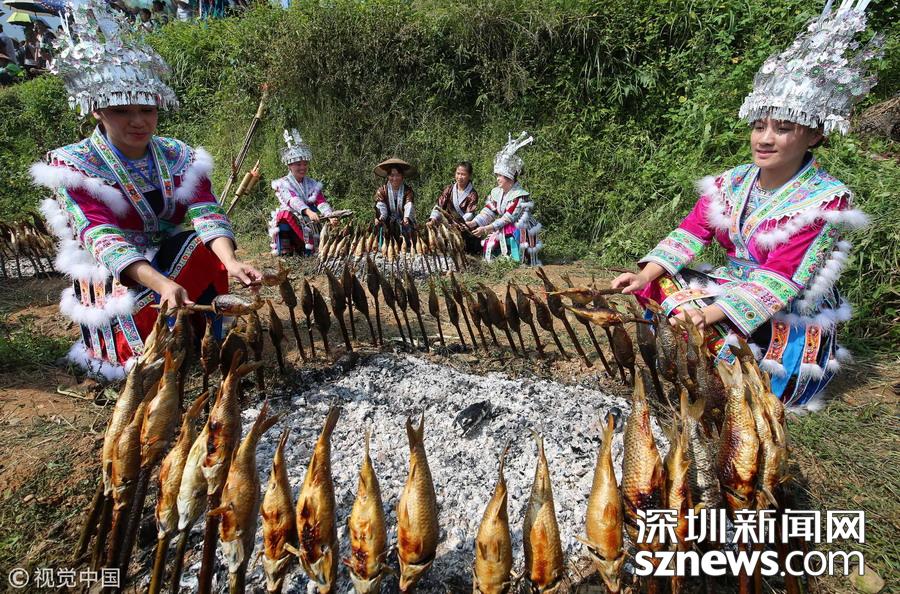 深圳新聞網(wǎng)訊 2018年9月15日,廣西柳州市融水苗族自治縣喜迎中國(guó)首屆“農(nóng)民豐收節(jié)”——2018金秋燒魚(yú)季啟動(dòng)儀式在桿洞鄉(xiāng)花孖苗寨舉行,數(shù)百名苗族群眾和游人共同開(kāi)展了水田拔河、田間捉魚(yú)、傳統(tǒng)打谷和燒魚(yú)等活動(dòng),慶祝豐收。