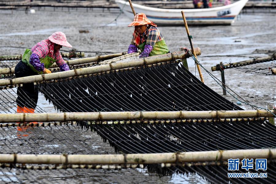 10月24日,福建莆田蔣山村村民在收獲紫菜。 新華社記者張國(guó)俊 攝