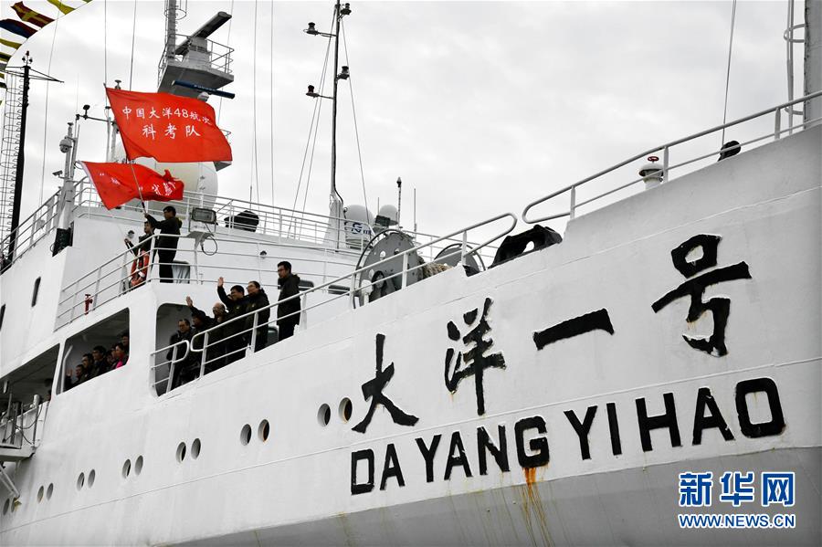 11月7日,科考隊(duì)員在“大洋一號(hào)”上向前來(lái)迎接的人群揮手致意。 新華社記者 李紫恒 攝