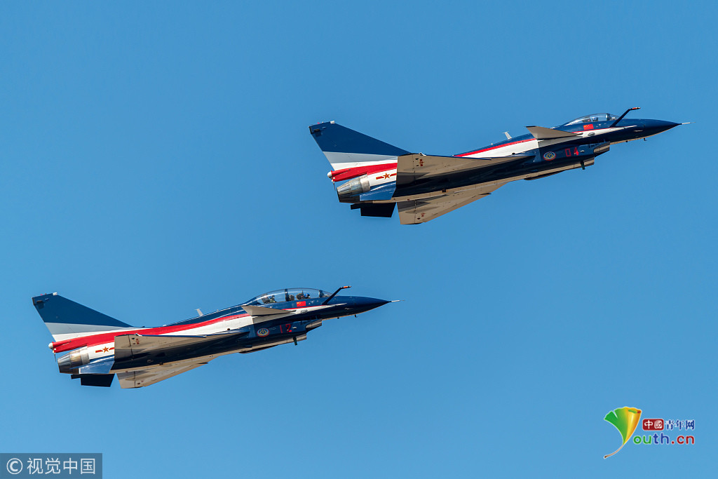 圖六:2018年11月6日,廣東珠海航展上,兩架八一飛行表演隊(duì)的殲-10A飛機(jī)。
