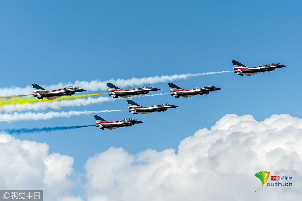 2018年11月8日,廣東珠海,第十二屆中國(guó)國(guó)際航展第三天??哲姟鞍艘弧憋w行表演隊(duì)的隊(duì)員們,發(fā)揚(yáng)連續(xù)作戰(zhàn)精神,給觀眾們表演了七機(jī)分組開花、四機(jī)編隊(duì)橫滾等高難動(dòng)作,受到觀眾們的稱贊。視覺中國(guó)