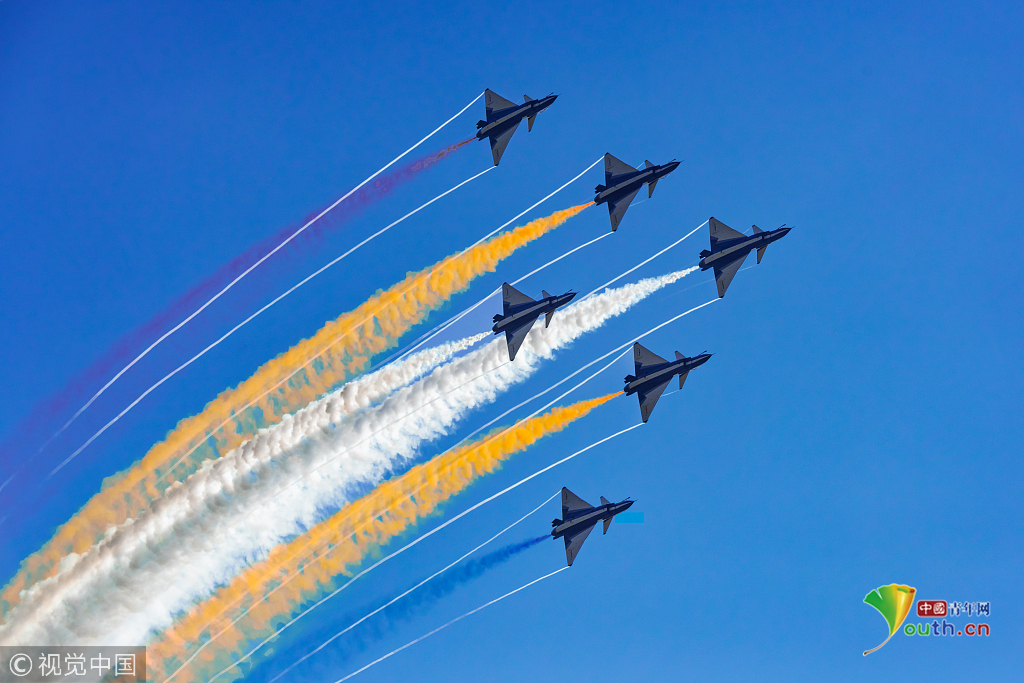 2018年11月6日,第十二屆中國國際航空航天博覽會在珠海拉開帷幕。八一飛行表演隊的殲-10率先上陣,為觀眾獻上精彩的飛行表演。視覺中國