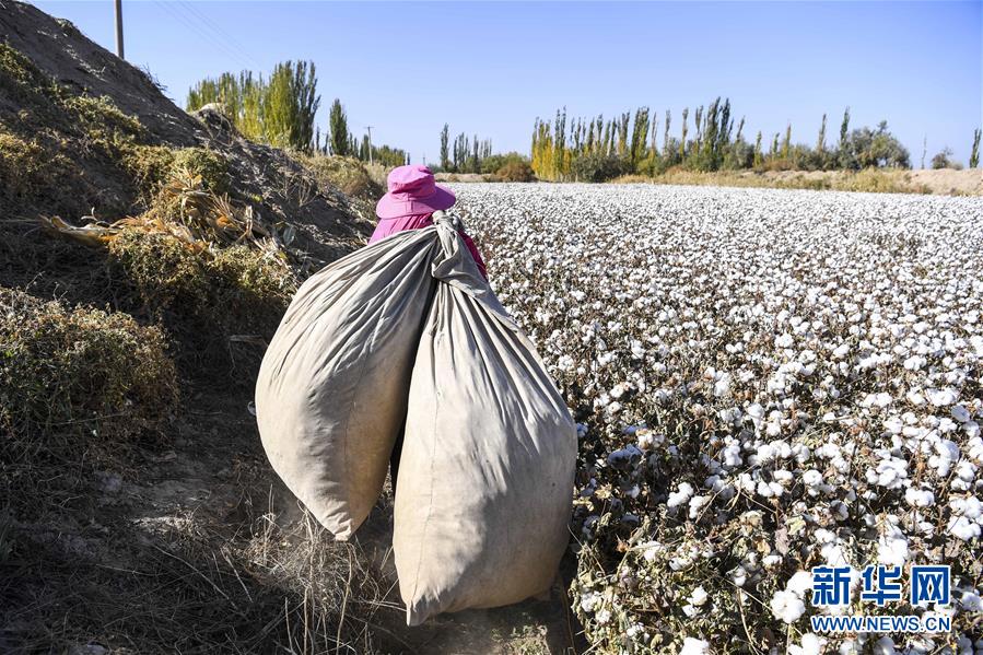 在新疆巴楚縣多來(lái)提巴格鄉(xiāng)卡扎尼塔皮提村,陳喜波背著兩袋棉花行走在棉田里(10月24日攝)。