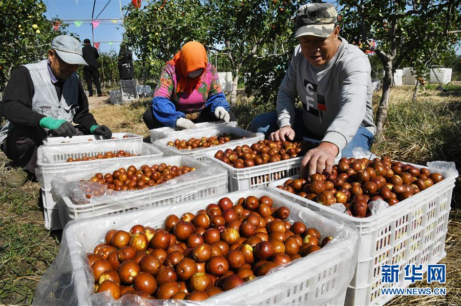 10月17日,在山東省青島市即墨區(qū)藍村鎮(zhèn)王演莊北村,種植戶在果園里收集采摘的大棗。 金秋時節(jié),農(nóng)民們忙著收獲成熟的農(nóng)作物,喜迎豐收。 新華社記者 李紫恒攝
