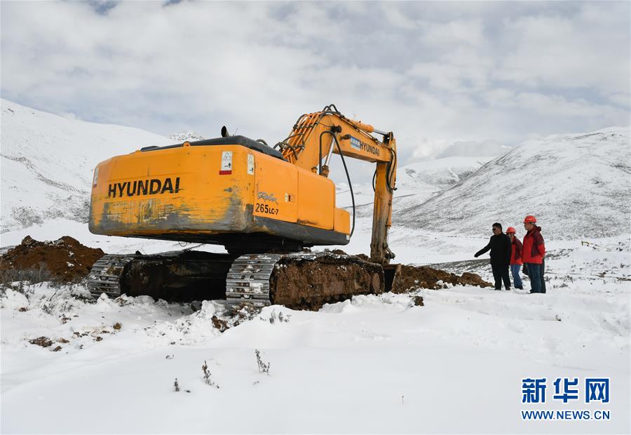 工作人員駕駛大型機(jī)械在昌都市江達(dá)縣的高山牧場(chǎng)上搶通道路(10月14日攝)。新華社記者 劉東君 攝