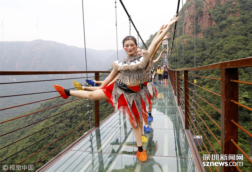 2018年6月30日,鄭州新密一景區(qū)的玻璃吊橋上,幾名美女大學生身穿“野人”服裝練習瑜伽,吸引了眾多游客的圍觀。據了解,這些大學生來自鄭州。