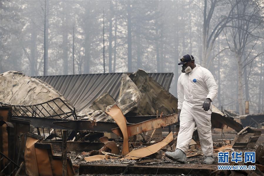 11月13日,在美國(guó)加利福尼亞州天堂鎮(zhèn),搜救人員在山火過后的廢墟工作。