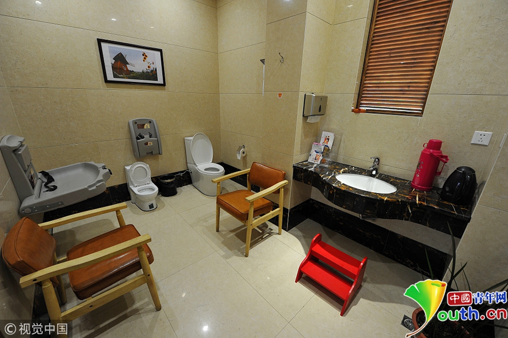 “第5空間”男女廁所的廁標別具特色,選用京劇臉譜的形式,讓人充滿了新奇感。公廁內(nèi)設有母嬰室,里面安裝了各類為帶嬰兒的媽媽們上廁所提供便利的設施,除洗手池和供兒童、成人專用坐便器外,還有折疊式的嬰兒座椅和護理臺,這樣帶嬰兒的媽媽進來如廁,就可以把孩子安全地放在椅子上;如果孩子需要換尿布,也可以在護理臺上完成?! ?/p>