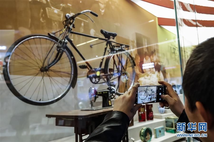 11月15日,在“歷史巨變”展區(qū),一名參觀者在拍攝老式自行車和縫紉機。