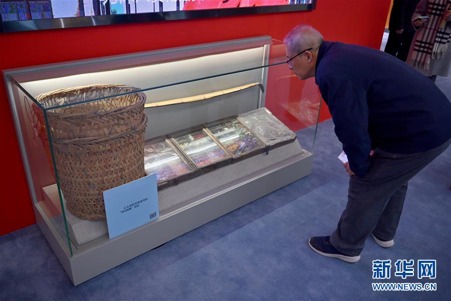 11月15日,一名參觀者在“歷史巨變”展區(qū)觀看義烏貨郎早期使用的“雞毛換糖”貨擔。