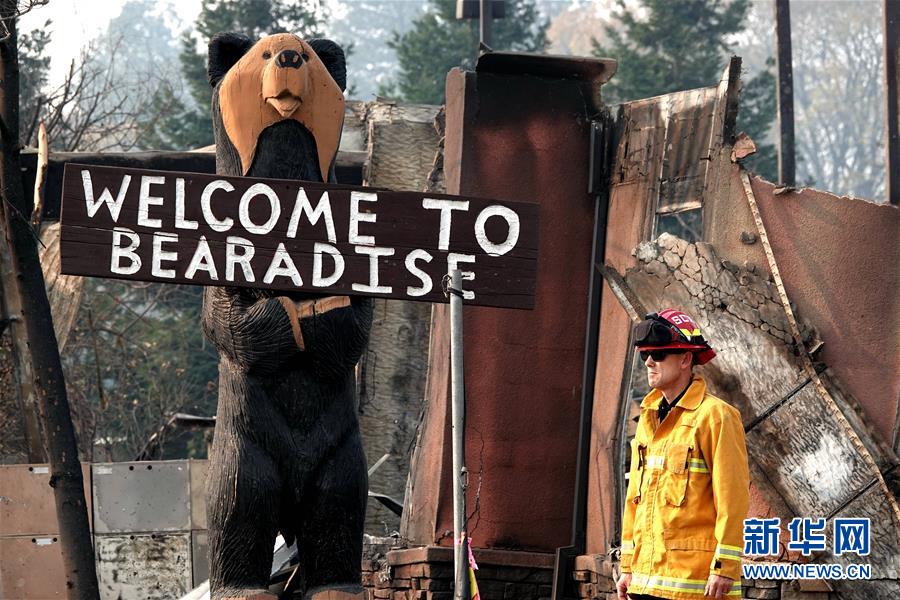11月18日,在美國加利福尼亞州比尤特縣天堂鎮(zhèn),一名消防人員站在廢墟旁。 新華社記者吳曉凌攝