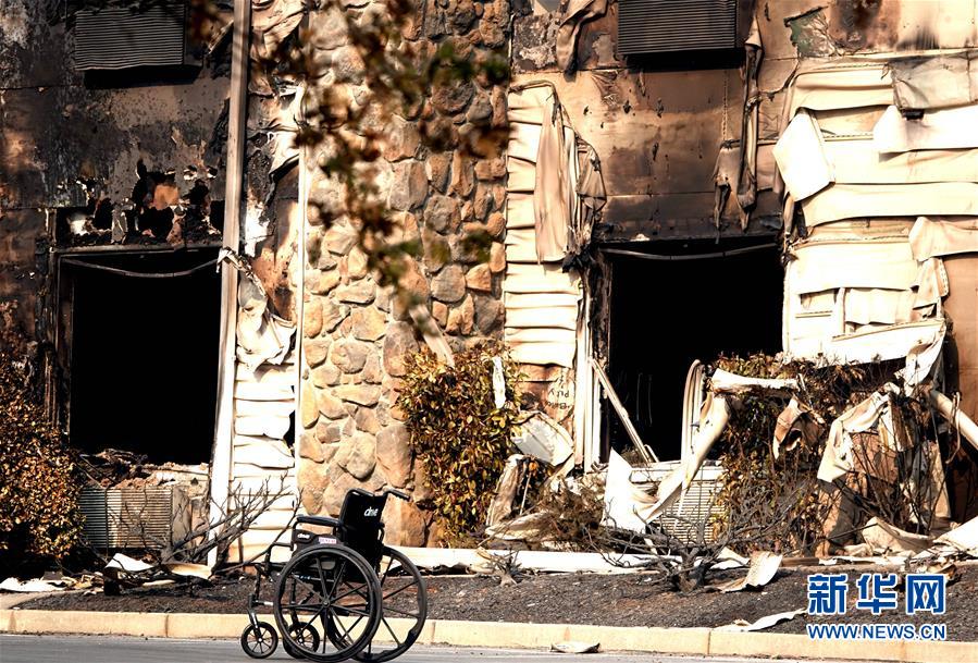 11月18日,在美國加利福尼亞州比尤特縣天堂鎮(zhèn),一個(gè)輪椅被棄置在一幢遭焚毀的住所旁。 新華社記者吳曉凌攝