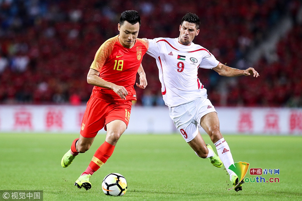 2018年11月20日,???,2018國(guó)際足球友誼賽,中國(guó)男足Vs巴勒斯坦。郜林拼搶 圖片作者:null