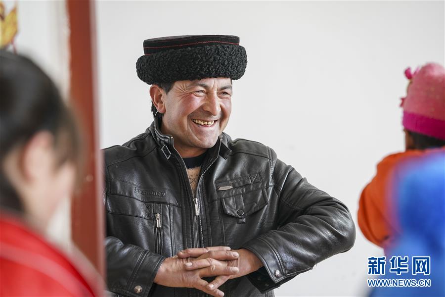 在塔什庫爾干塔吉克自治縣塔提庫力易地扶貧搬遷安置點(diǎn)的新房?jī)?nèi),都熱·加爾曼與前來看望他的鄰居聊天(11月18日攝)。新華社記者胡虎虎攝