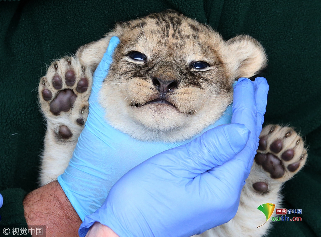 《我快要窒息了。。》2016年7月28日訊,英國斯特靈,布萊爾德拉蒙德野生動物園四只三周大的幼獅接受首次健康檢查。