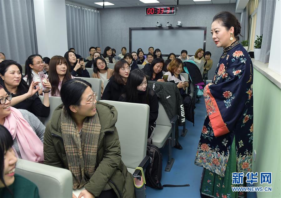 11月30日,在北京服裝學院,畢紅身著傳統(tǒng)服裝在課堂上向師生介紹清代女性服飾。 新華社記者李賀攝
