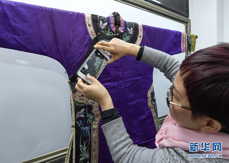 11月30日,在北京服裝學院,一名學生在拍攝清代女性服裝的細節(jié)。 新華社記者李賀攝