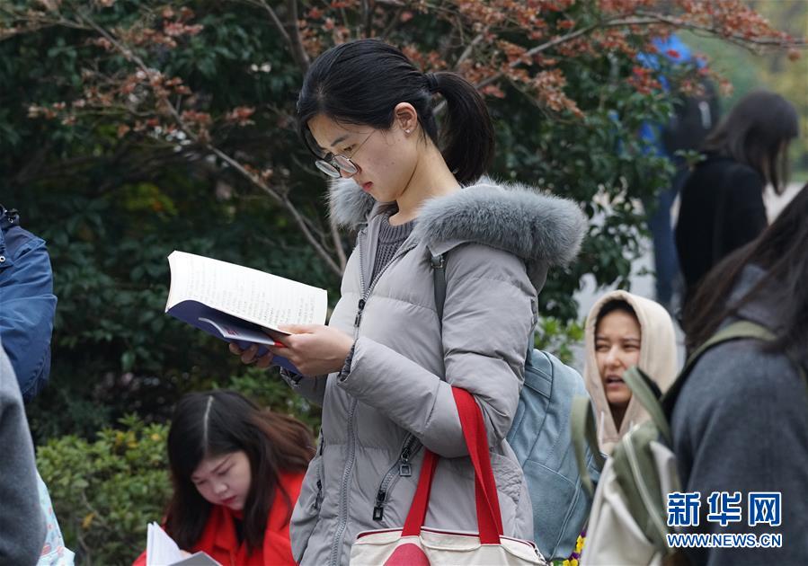12月2日,在南京林業(yè)大學(xué)考點(diǎn),一名考生在等候進(jìn)場時(shí)復(fù)習(xí)。 新華社記者 孫參 攝